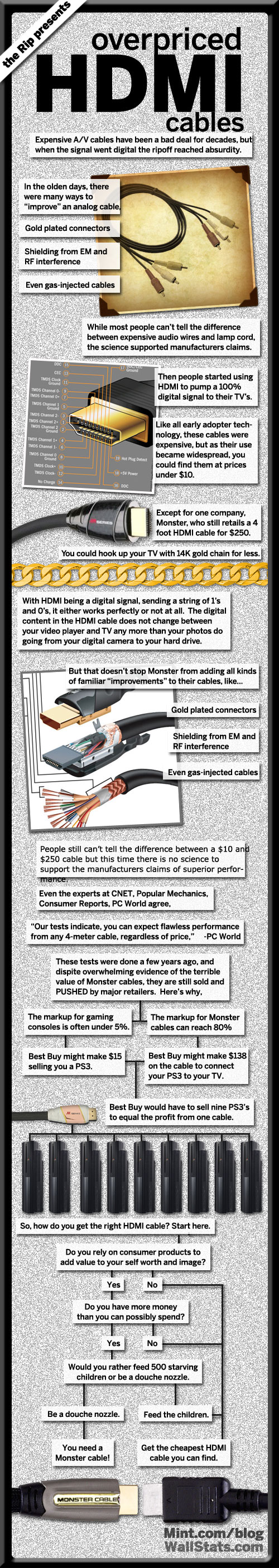 Stay away from those over-priced HDMI cables that Best Buy pushes (i.e. Monster Cables). Instead, check out Amazon.com or anywhere else on the Internet where you can get a good quality HDMI cable for well under $10. The Mint.com blog said it best with this infographic: